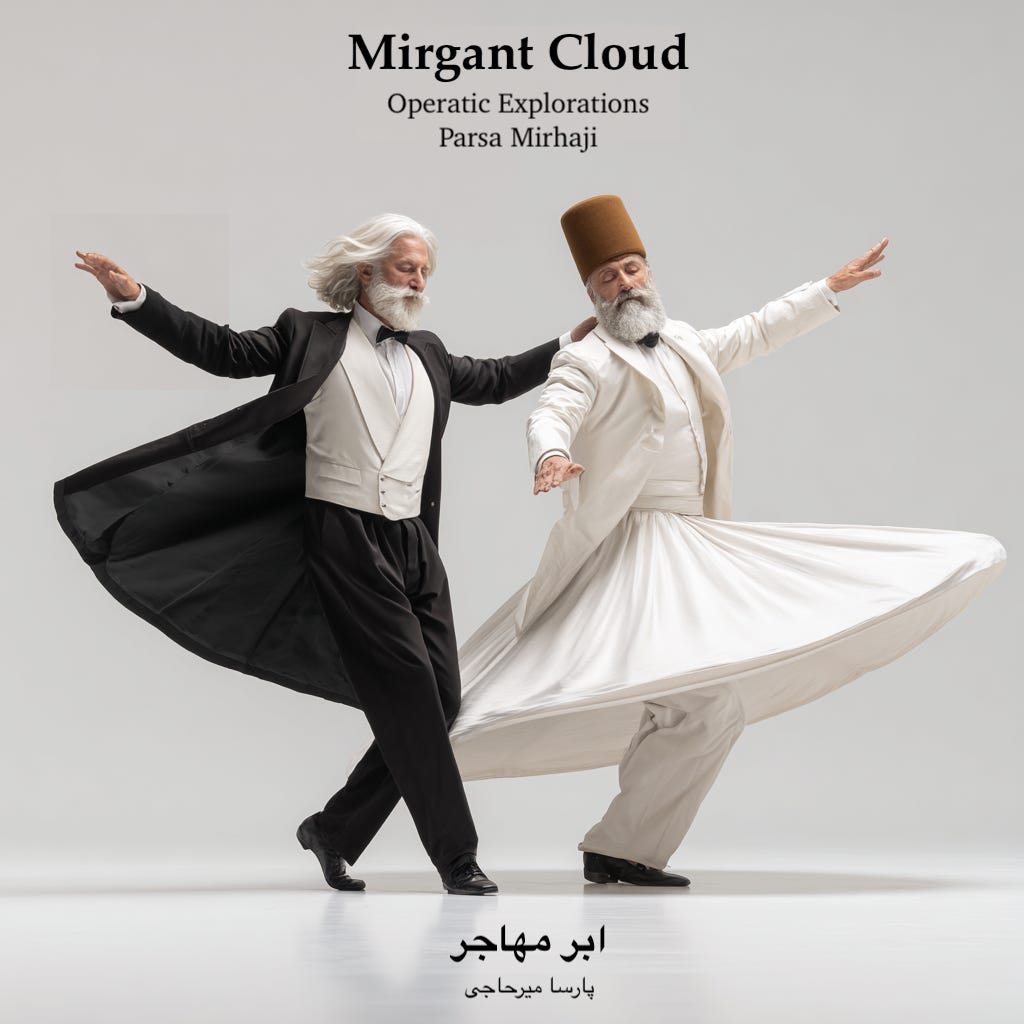 Migrant Cloud is a musical exploration of Persian poetry delivered through Western operatic traditions. Four original poems. Sixteen tracks organized into two continuous albums (Migrant Cloud and Mirage Opera) with a distinct creative direction and intention: Contemporary Persian verse arranged purposefully to be projected through the elaborate machinery of Western opera. The album cover captures the essence of this experiment, two traditions, two vocabularies of transcendence, engaged in a harmonious motion.